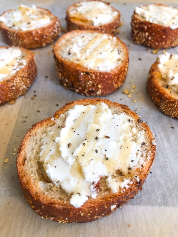 I sliced the bread, gave a generous drizzle of olive oil on top of the bread, baked for approximately 5 minutes until toasted, slathered the goat cheese on top, drizzled golden honey, and sprinkled with fresh cracked pepper.