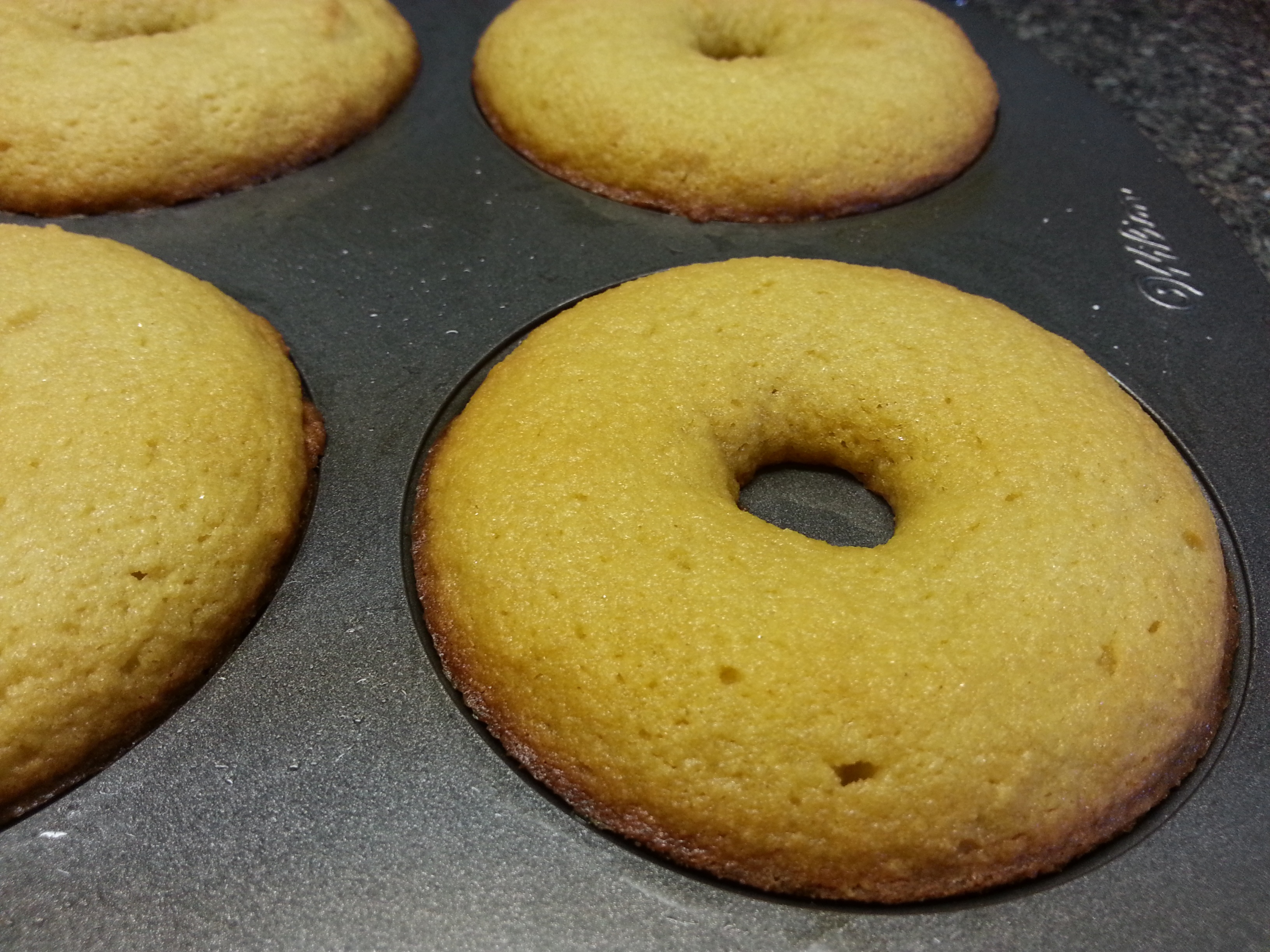 4. Using a dessert spoon, spoon the batter into the circles of a well-greased donut pan. (I used 2 6-circle donut pans.) Bake for 15 minutes or until a toothpick comes out clean. Once cooled, remove donuts from the donut pan.