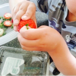 I showed him the order and he was able to complete all the steps by himself. Some kids may only be able to put a few berries in the bag, some may only be able to put the berry filled bags in the container. As long as they are “helping”, it makes for a great thing to do together. You might as well get some work out of them, right?