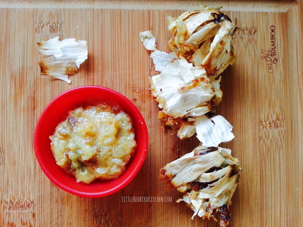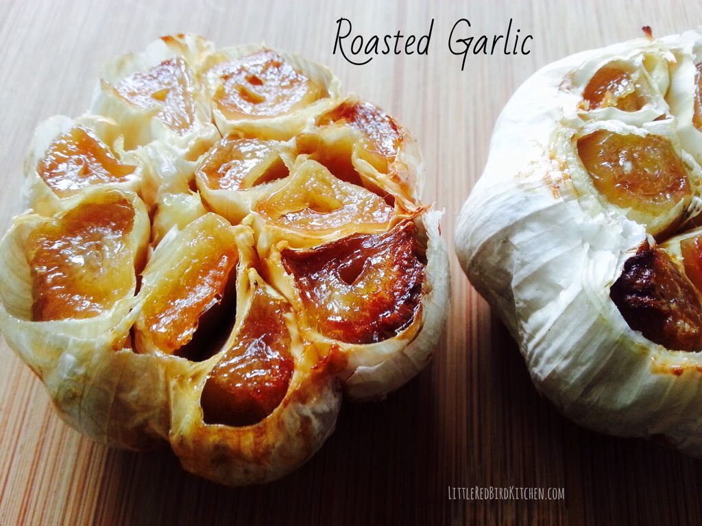 I LOVE garlic, but even more, I love it roasted. I almost always keep roasted garlic in the refrigerator and use it anywhere garlic is called for. Any time you roast something, you bring the natural sugars within the ingredient to the surface that is visible by the caramelization on the top. The flavor is much milder and surprisingly, sweet. You could literally use it as a spread all by itself.