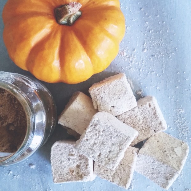 Pumpkin spiced marshmallows. Yes, please. I have been experimenting these past few weeks with Alton Brown’s marshmallow recipe. I’ve made substitutions here and there and was able to come up with these pumpkin spiced marshmallows. I passed them out for about a week to get feedback and received a lot of “mmmm’s” and “wow’s!”
