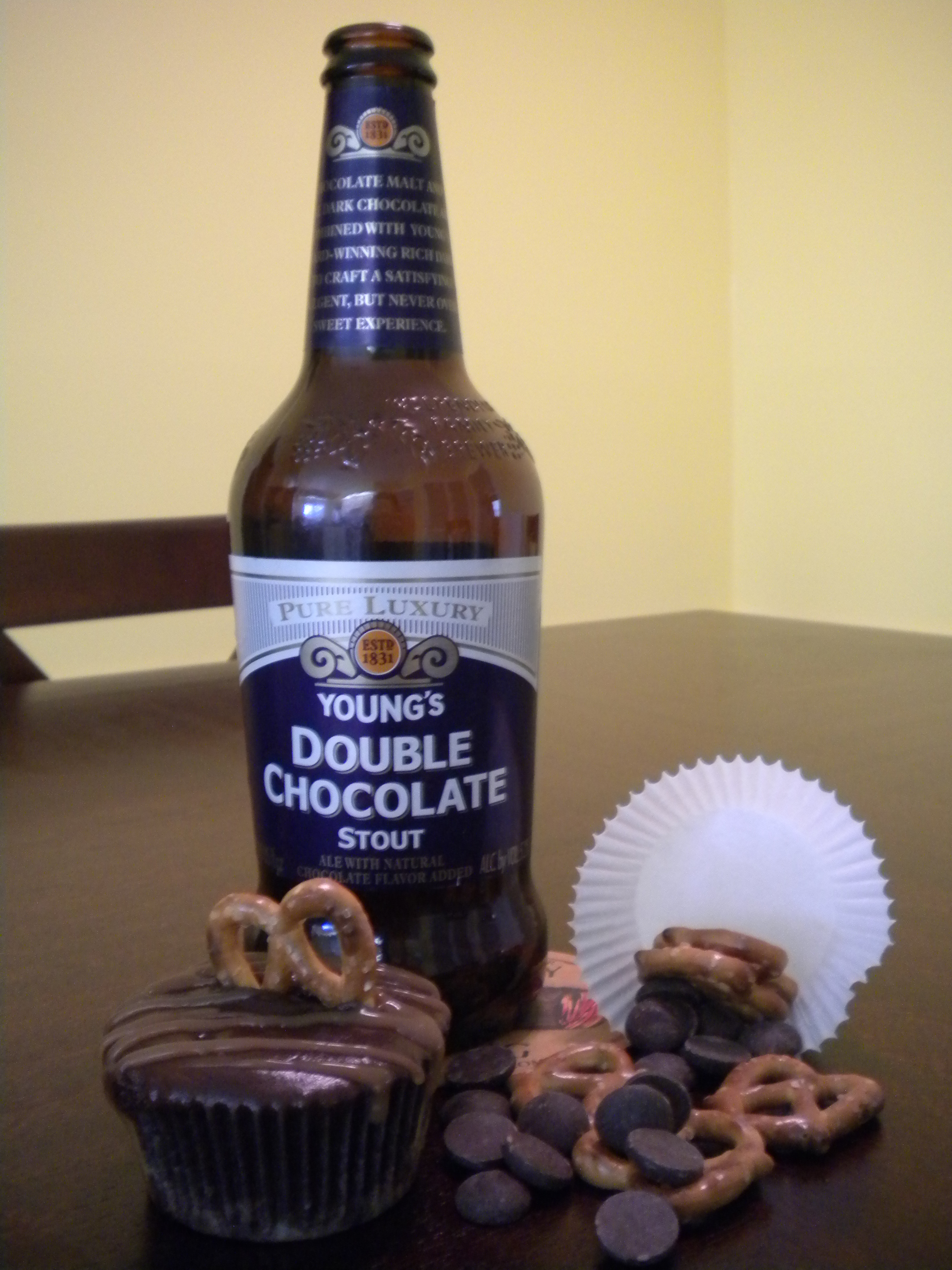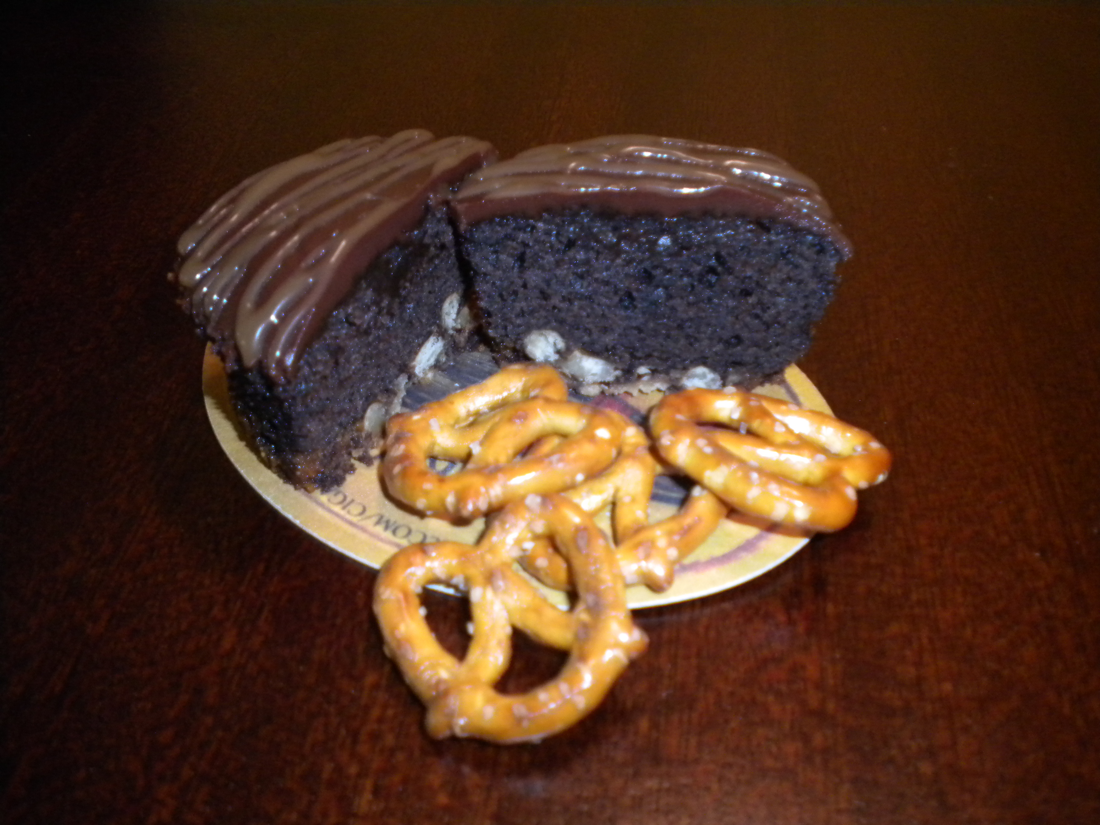 My latest cupcake creation. This is my take on a pub favorite of pretzels and beer. I call it “The Dark Ale PubCake”. This is a dark chocolate cupcake infused with Young’s double chocolate stout beer. This cupcake has a pretzel bottom crust and is topped with a bittersweet ganache and drizzled with a homemade salted caramel. The garnish, a pretzel. These are available through LRBK for $30 per doz. (1 doz. minimum).
