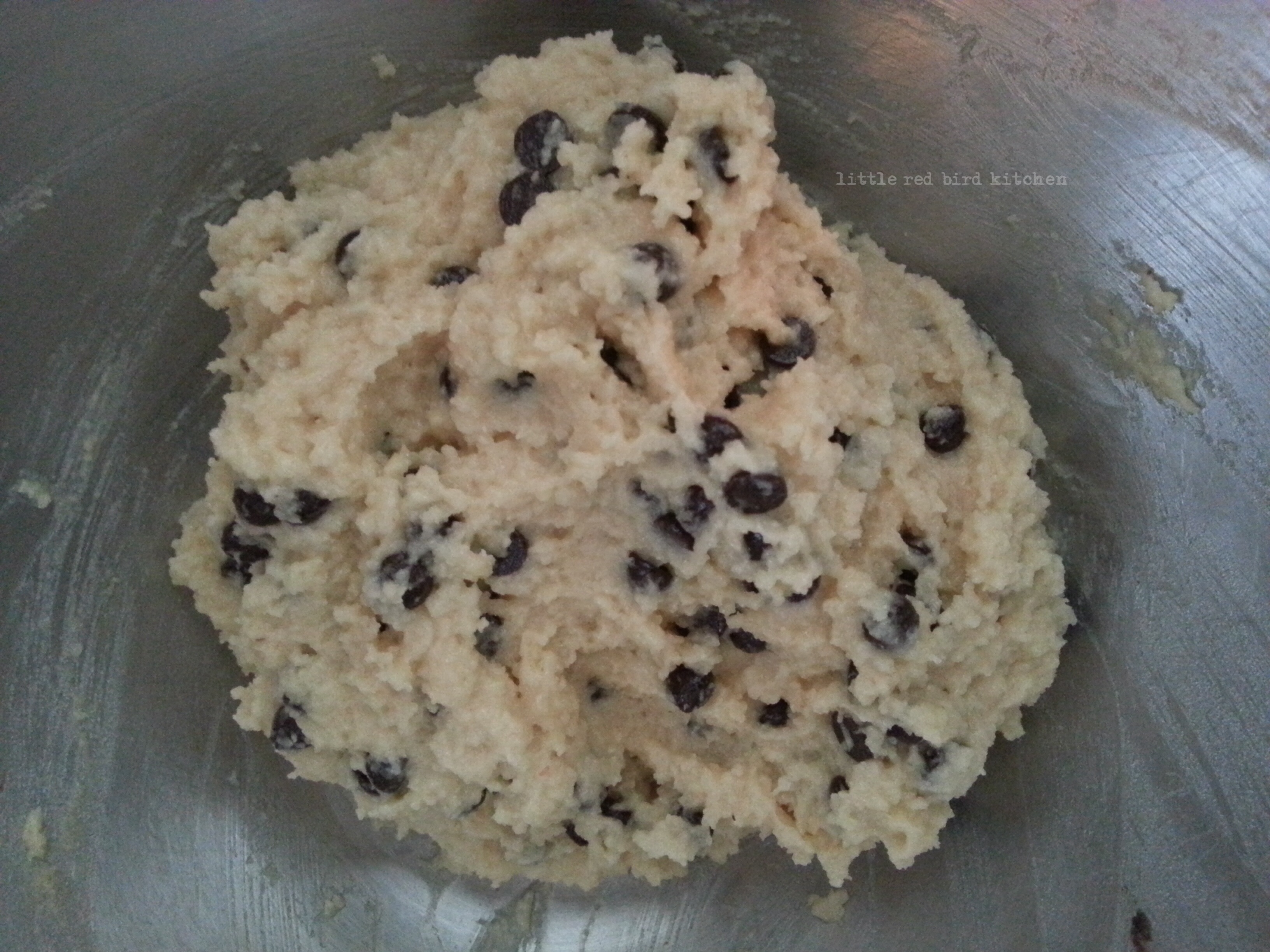 3. Next, add the almond flour, vanilla, salt, and baking soda and mix until it’s all incorporated. Fold in the chocolate chips.