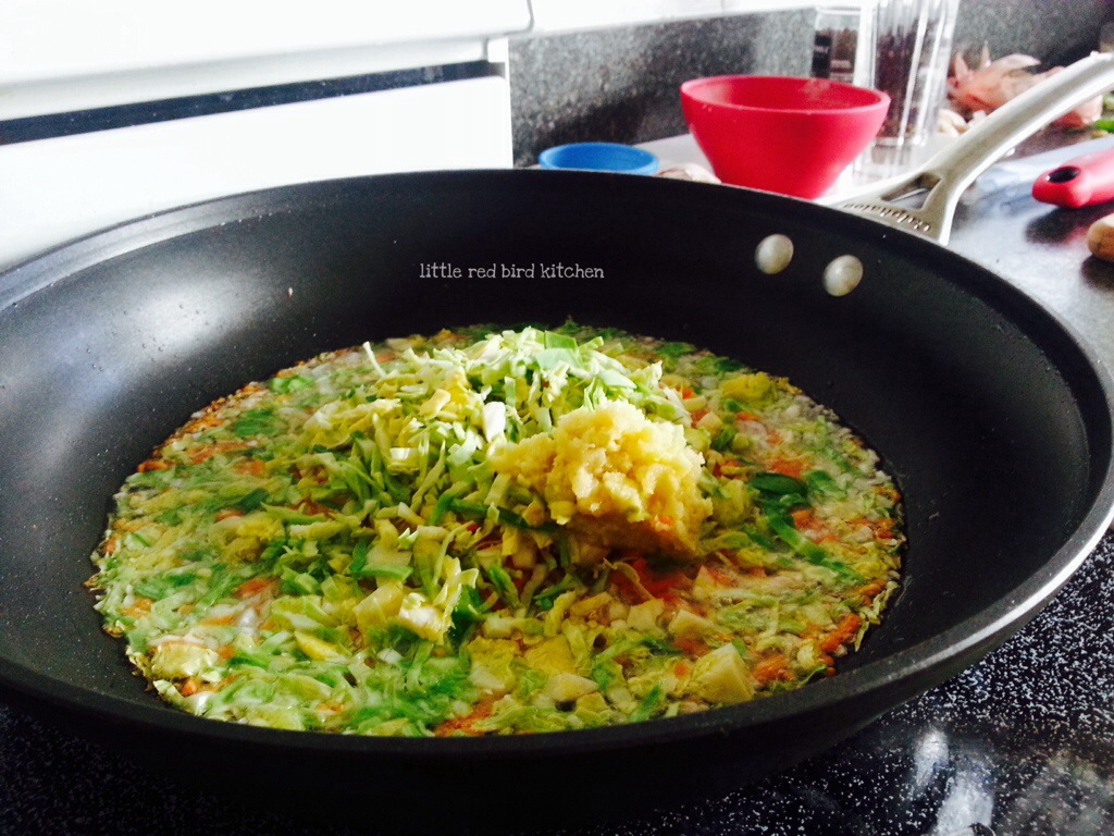 2. Turn on oven to 350 degrees. Heat a pan to medium high heat. Add coconut oil to the hot pan, then add the garlic and ginger and cook until fragrant. Add shredded and minced veggies and cook until soft. (3-5 minutes).